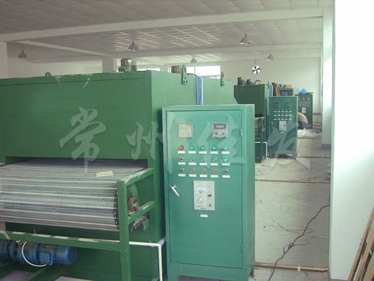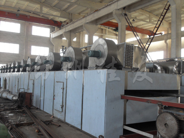 物料由加料器均勻地鋪在網(wǎng)帶上,網(wǎng)帶一般采用12-60目不銹鋼絲網(wǎng),由傳動(dòng)裝置拖動(dòng)在干燥機(jī)內(nèi)移動(dòng)。干燥機(jī)由若干單元組成,每一單元熱風(fēng)獨(dú)立循環(huán),部分尾氣由專(zhuān)門(mén)濕風(fēng)機(jī)排出,廢氣由調(diào)節(jié)閥控制,熱氣由下往上或由上往下穿過(guò)鋪滿物料的網(wǎng)帶完成熱量與質(zhì)量傳遞的進(jìn)程,帶走物料的水份。網(wǎng)帶緩慢移動(dòng),運(yùn)行速度可根據(jù)物料溫度自動(dòng)調(diào)節(jié),干燥后的成品連續(xù)落入收料器中。上下循環(huán)單元根據(jù)用戶需要可靈活配備,單元數(shù)量亦可根據(jù)需要選取。